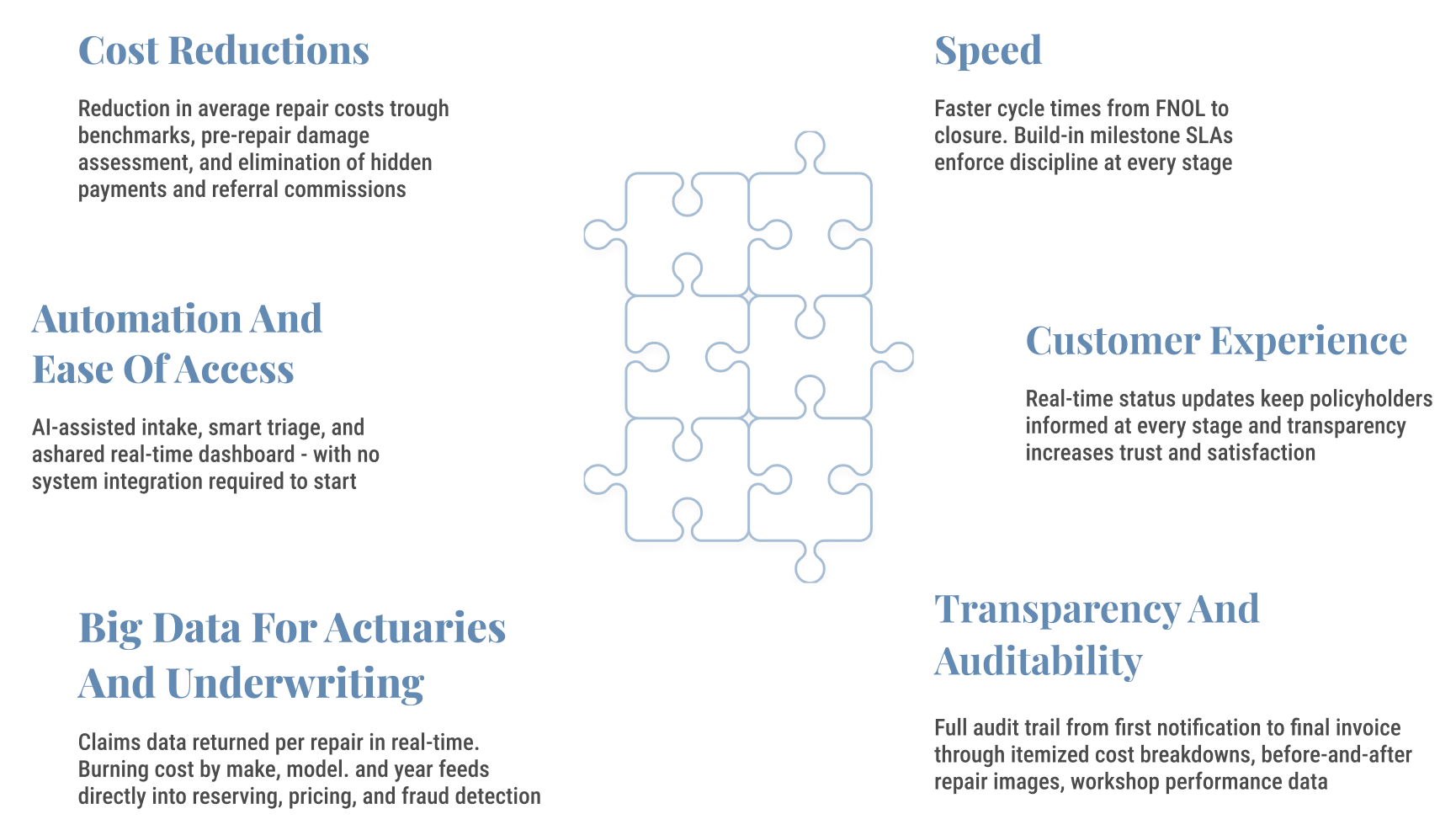 Every benefit traces back to one structural change: an independent, compliance-grade operation sitting between the insurer and the repair chain, with the data infrastructure to prove what happened and what it cost.
